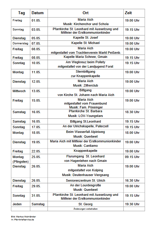 • Bild: Sr. M. Jutta Gehrlein In: Pfarrbriefservice.deMaiandachten und Bittgänge 202618. April 2026 - 09:58