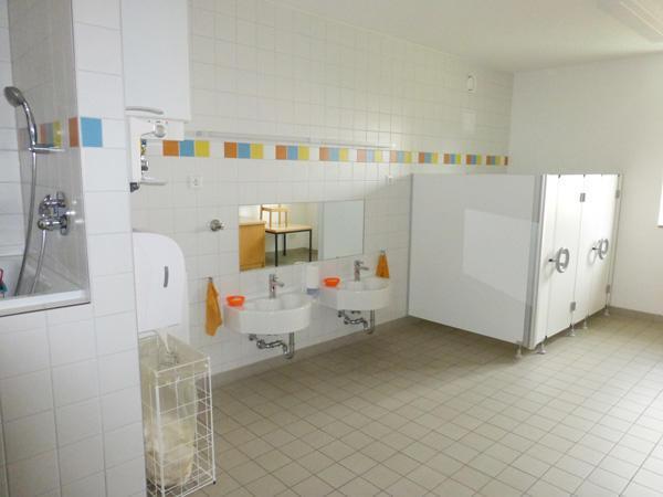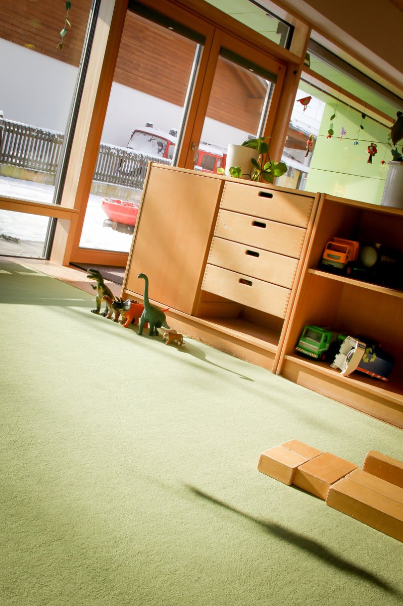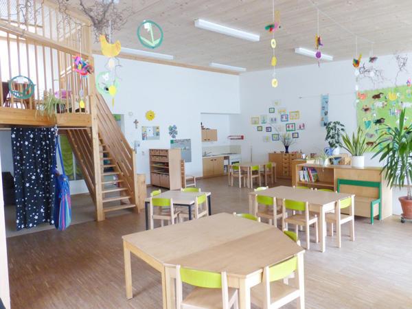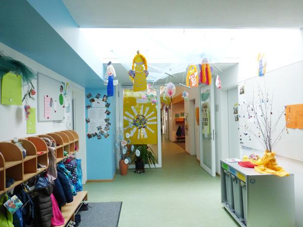 Innenräume: Im Erdgeschoss stehen uns neben 4 Gruppenräumen ein Werkraum, ein Toilettenraum, eine Küche und ein Büro zur Verfügung. Die Krippenkinder haben einen eigenen Wickel– und Schlafraum. Im 1. Stock befinden sich unser Turnraum, ein Geräteraum, 2 Therapieräume und ein Personalraum.
