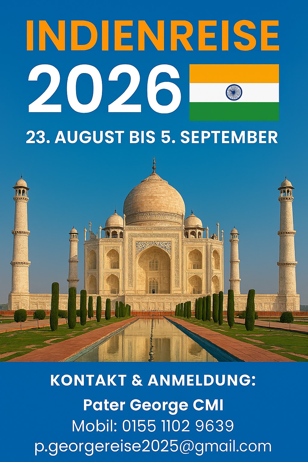 Anfragen und Anmeldung bei P. George unter der Telefonnummer 0155/11029639 oder per E-Mail an p.georgereise2025∂gmail.com.